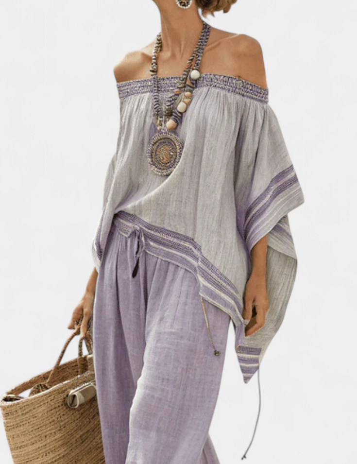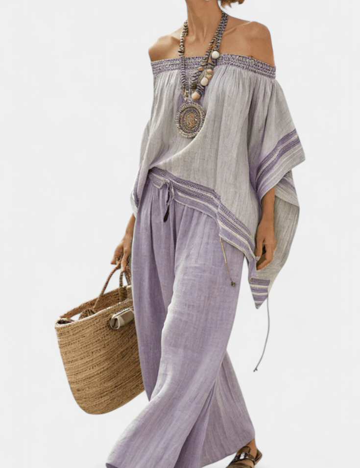 Bambusový top s pruhy, s odhalenými rameny a širokými kalhotami pro elegantní a svěží styl