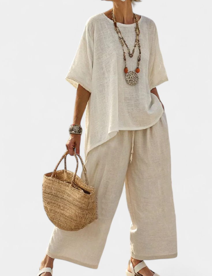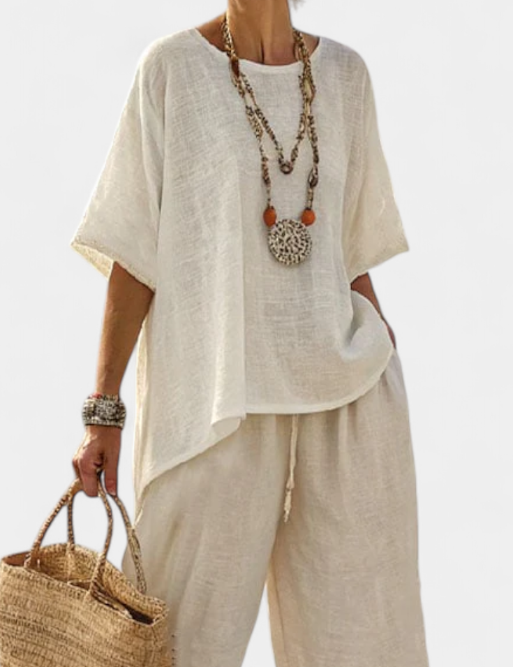 Celkový minimalistický Daisy v přírodních odstínech s oversized blůzou a širokými kalhotami pro jednoduchý a elegantní styl