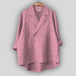 Elegantní lněná blůza v jemné barvě, která vyzařuje ženskost a nadčasový styl. Má V-čkový průstřih a elegantní klopový límec, zatímco její volný střih poskytuje pohodlí po celý den. Asymetrický střih s delším zadním dílem dodává moderní pohyb každému outfitu.