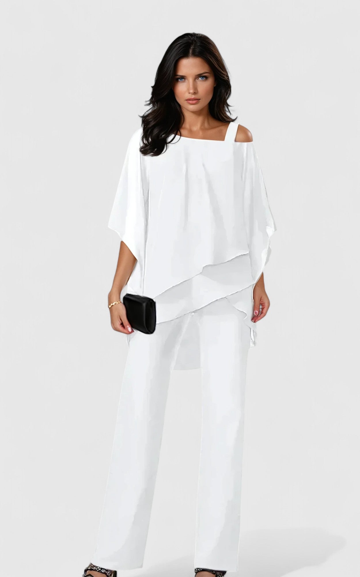 • Top: Asymetrický vrstvený design s odhalenými rameny