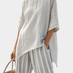 Poklidný styl s moderními liniemi. Sada Daisy kombinuje asymetrické tričko s volným střihem a pruhované kalhoty v neutrálních tónech, čímž vytváří vyvážený, svěží a elegantní vzhled pro teplé klimatické podmínky.