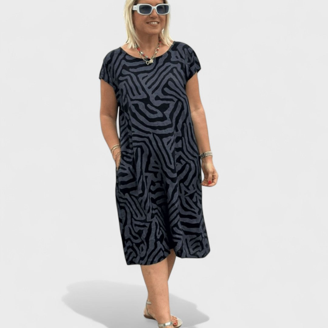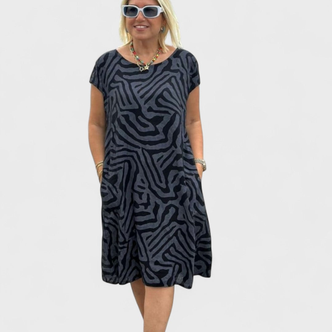 Šaty Nelia nabízejí příjemně padnoucí střih s jemným kulatým výstřihem a volnou sukní, která elegantně splývá při každém kroku. Květinový či stylový grafický potisk v jemných barvách dodává vzhledu svěžest a hravost. Ideální volba pro příjemné dny ve městě, zahradní oslavy nebo relaxaci u kávy.