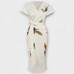 Okouzlující zavinovací midi šaty s živým listovým potiskem a lichotivým V-výstřihem. Ideální pro jakoukoli příležitost, od brunchů po venkovní akce.