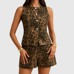 Komplet Dobromila spojuje bezrukávovou džínovou vestu na knoflíky s elegantními šortkami a vytváří moderní a univerzální vzhled.