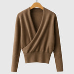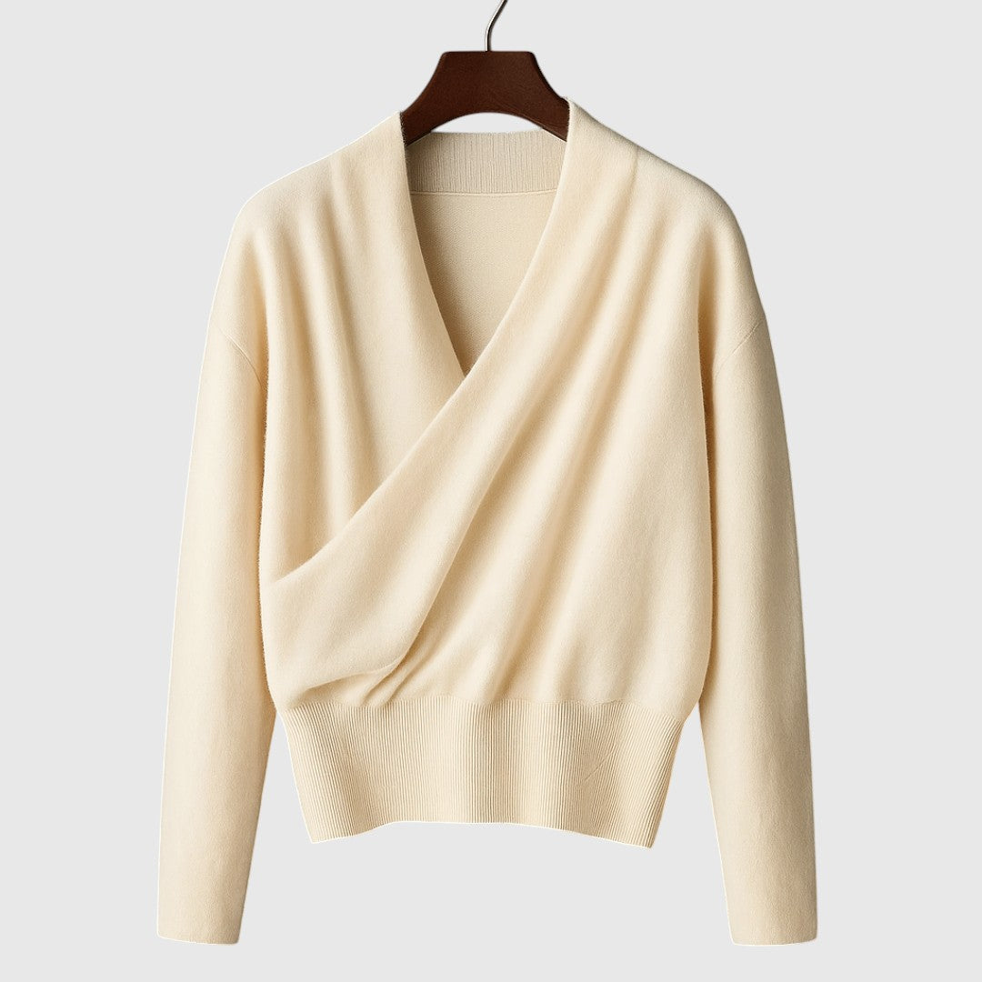 Elegance, která obejme. Elena je zavinovací svetr s výstřihem do „V“ a krásným splýváním, které opticky prodlužuje postavu a povýší každý outfit – od kanceláře po večeři.